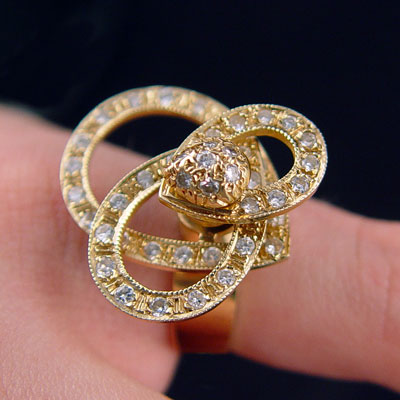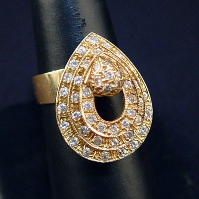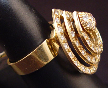 14K AND DIAMOND MECHANICAL ''SPINNER'' RING: With 47 round brilliant cut diamonds, approx. 1 Ctw., average VS-SI in clarity and H-I color. The diamonds are deep set in tear shaped cut outs that are attached to a ball bearing mechanism. Size 7 Weight 9.1 gr. No Reserve.