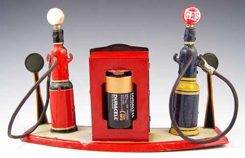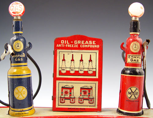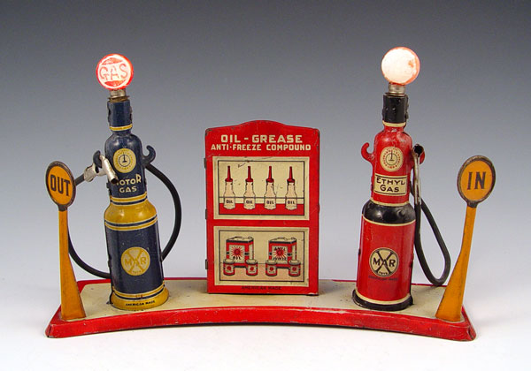 1930'S TIN LITHO MARX GAS LIGHT UP GAS PUMPS: Circa 1930's Marx light up gas pumps and oil station. Marked Marx American Made. Gas lights above pumps light up with single D battery. Minor flaking and rubbing to litho. Replacement hoses. Measures 6'' high x 9 1/2'' wide.