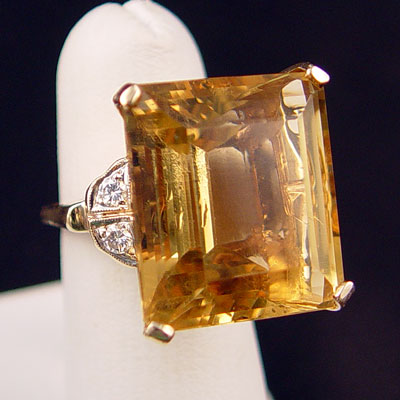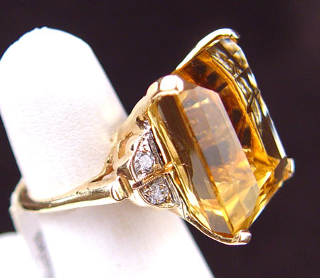 A 35 CT CITRINE AND DIAMOND RING: 14K yellow gold ring with one emerald cut citrine. Weight: 35.00 Ct. Approx. VVS in clarity (Type I), oY in Hue, 3 in Tone and 2 in Saturation. Accented with 4 round brilliant cut diamonds. Weight: .20 Ct. Approx. Rated VS in clarity and H in color. The diamonds and citrine are prong set. Weight: 13.9 grams. Size: 6 No Reserve.
