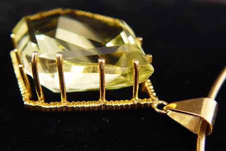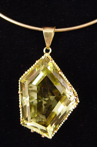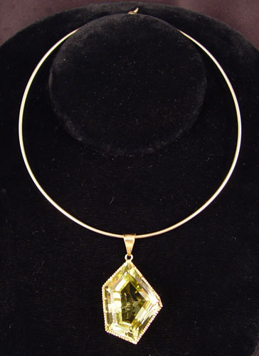 70 CT. CITRINE PENDANT NECKLACE: 14k yellow gold rigid wire necklace with 14K yellow gold pendant containing 1 irregular pentagon shaped step cut ''lemon'' citrine, Weight: 70.00 Ct. Approx. Rated VVS in clarity (type I), vslgY in Hue, 2-3 in Tone and 2 in Saturation. 11.9 gram collar necklace. No Reserve.