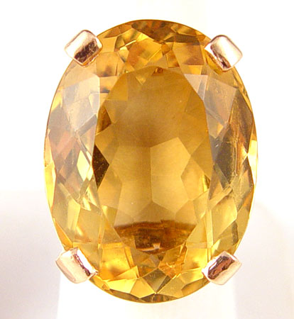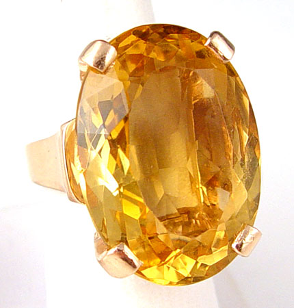 A 50 CT. CITRINE IN ROSE GOLD RING: 14K rose gold ring with one oval mixed cut citrine. Weight: 50.00 Ct. Approx. VVS in clarity (Type I), oY in Hue, 3 in Tone and 2 in Saturation. The citrine is prong set. Weight: 17.4 grams. Size 6.5 No Reserve.