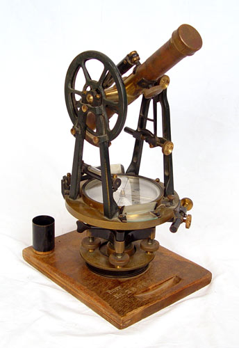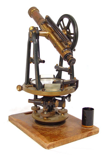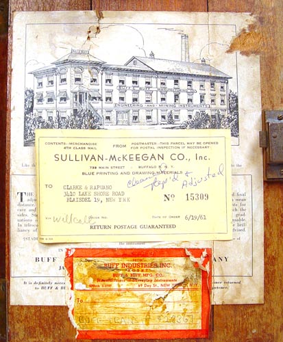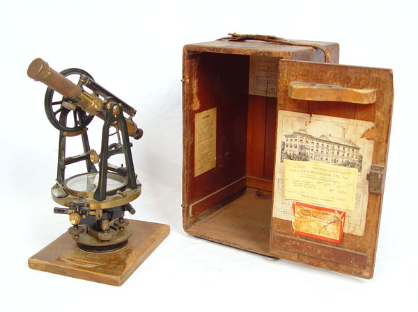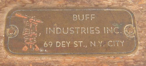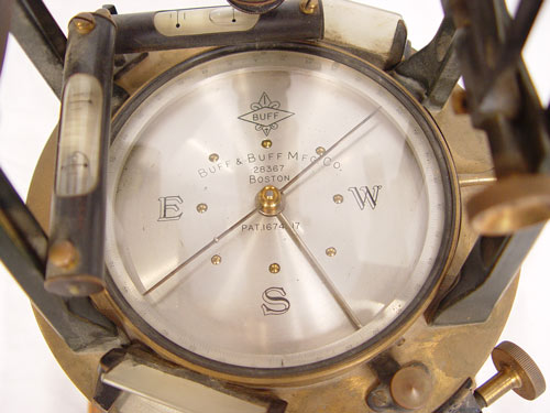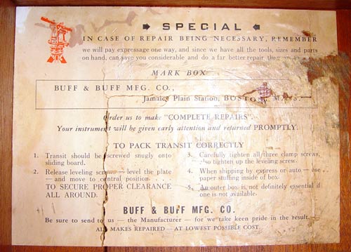 BUFF & BUFF SURVEYORS TRANSIT IN CASE: Serial number 28367, Buff & Buff Mfg Boston, black paint and brass. Comes in original box with paper instructions on inside and repair label from 1961 Sullivan & McKeegan Co. Case has Buff Industries metal tag, New York. Transit rotates and adjusts fine, original level. Case shows signs of many years of use, original leather strap. Case measures 16 1/2'' high x 9 1/4'' wide x 11 1/4'' deep.