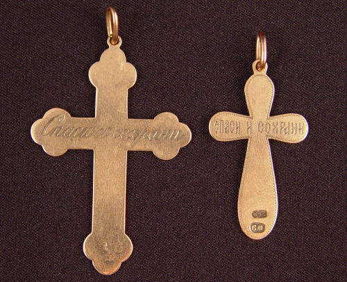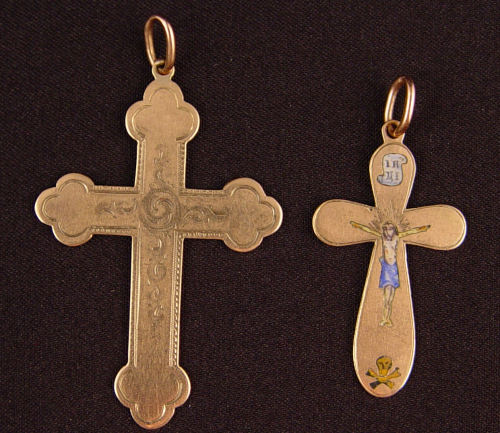 2 VICTORIAN RUSSIAN GOLD CROSS PENDANTS: Two 14K yellow gold Victoria crosses. One measures approx. 2'' in length with engraved design. One measures approx. 1 ½'' in length with enamel decoration. Both have inscriptions on the reverse. Weight: 9.5 grams. No Reserve.