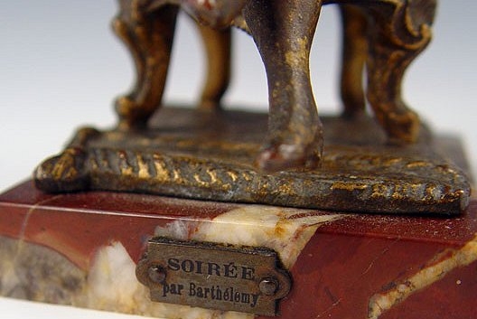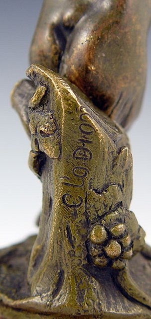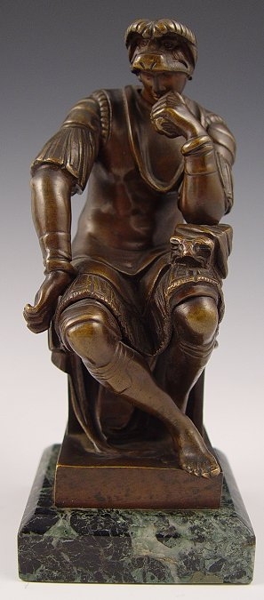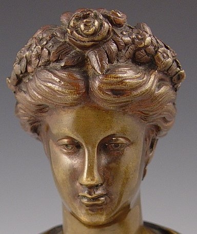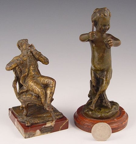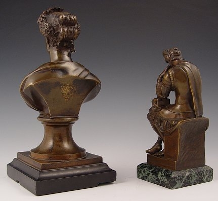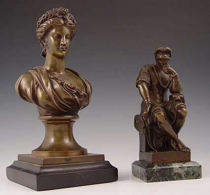 4 PIECE FIGURAL BRONZE LOT: Neoclassical Bust of a Maiden, 8'' h., 9'' with plinth, Lorenzo de' Medici after Michelangelo, 6 1/2'' h., 7'' with plinth, 2 part Faun child playing a triangle, marked Clodion, red marble plinth with damage, 6'' h.; ''Soiree'', after Barthelemy, 4'' h., red marble plinth with wear, later applied gold finish.