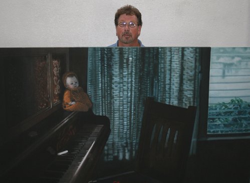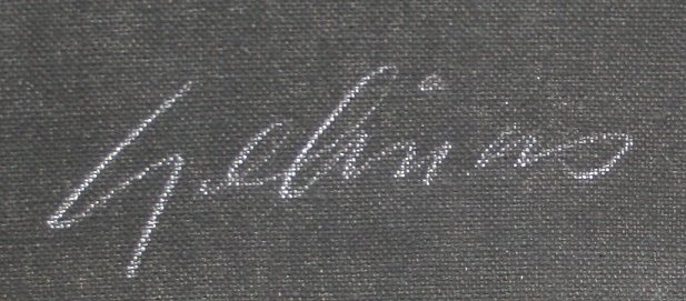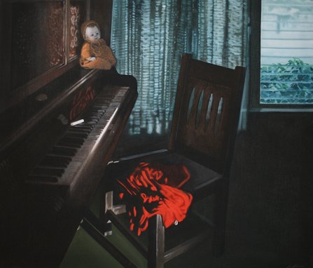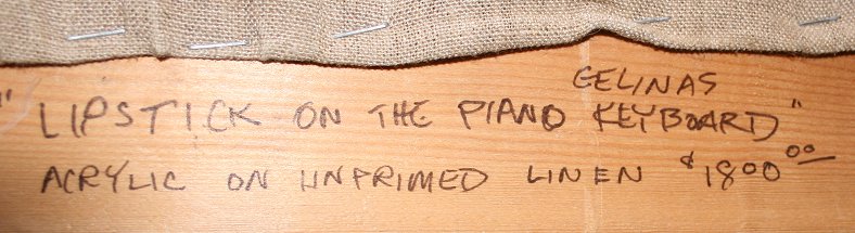 GELINAS, Robert, (American, 20th C.): ''Lipstick on the Piano Keyboard'', Acrylic on Unprimed Linen, 62'' x 72'', signed and titled verso, price of 1800, unframed.