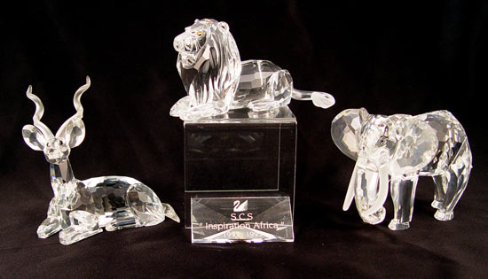3 PIECE SWAROVSKI INSPIRATIONAL AFRICA SERIES LOT: To include 1994 The Kudo (3 3/4'' high x 3 3/4'' long), 1995 The Lion (2 1/2'' high x 4 1/2'' long), 1993 The Elephant, (3 1/4'' high x 4 1/2'' long). All sold with original boxes and series plaque.