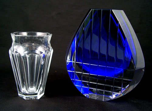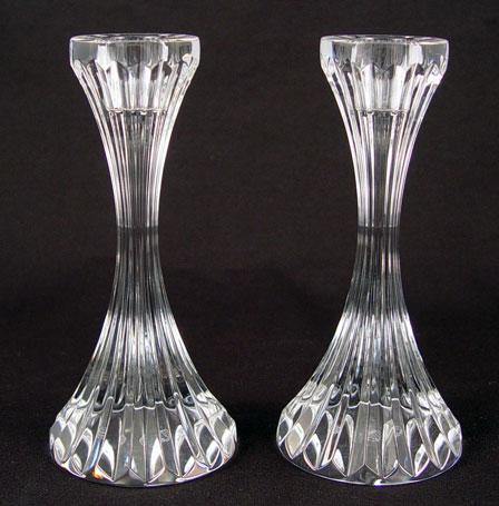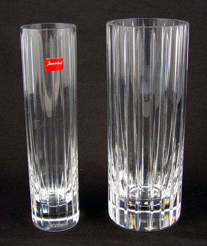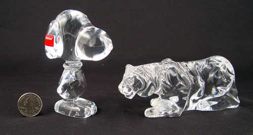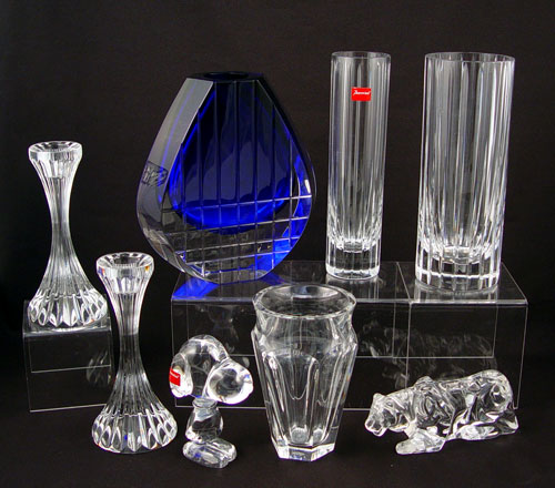 8 PIECE BACCARAT FRENCH CRYSTAL: To include 1) Snoopy Peanuts figure, signed & paper tag 4'' high. 2) Crouching lion or tiger, signed, 5 1/2'' long. 3) Pair Massena candle holders, signed 6'' high. 4) Harmony vase, signed and paper tag, 7 7/8'' high x 2'' dia.. 5) Harmony vase, signed 7 7/8'' high x 3'' dia., note 2 scratches. 6) Nelly vase, signed, 5'' high x 3 1/8'' top dia. 7) Cobalt and clear Blue Neptune bud vase, signed 7'' high x 6 5/8'' wide at widest point. No chips or cracks, no boxes.