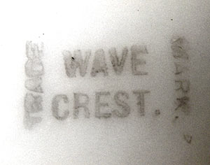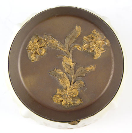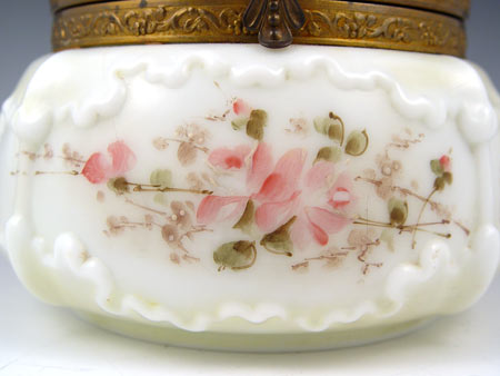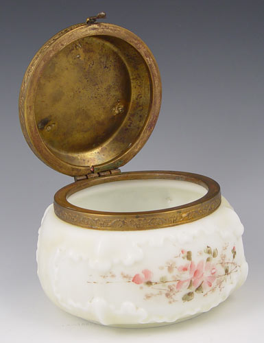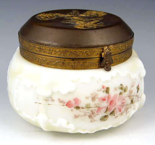 SIGNED WAVECREST POWDER JAR: Art glass by C.F. Monroe. Hinged metal lid. 4 1/2''h. x 5 1/2'' dia. overall.