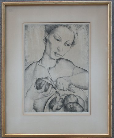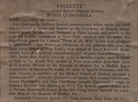 QUINTANILLA, Luis, (Spain, 1895-1978): ''Paulette'', AAA Etching, 14'' x 10'' sight size, pencil signed, AAA label verso, framed, 21'' x 17''. Quintanilla was reportedly rivaled only by Dali as the best Spanish artist of his time. Some darkened areas in print(toned).