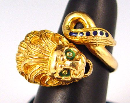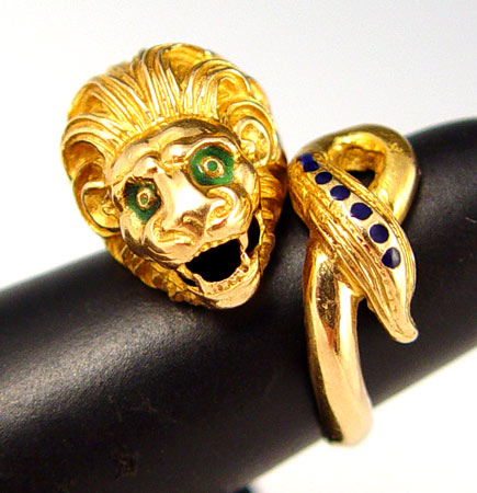 18K GOLD LION HEAD FIGURAL RING: 18K yellow gold ring depicts a lion head and tail. 5 round shaped mixed cut white sapphires. Weight: .08 Ct. Approx. Green enamel circles the eyes. Cobalt enamel spots on tail. Weight: 9.8 grams. Size: 7.5 No Reserve.