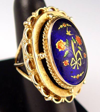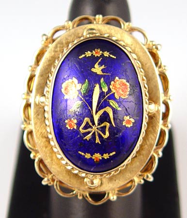 14K ISRAELI LARGE ENAMEL RING: 14K yellow gold ring, smooth and scalloped outer ellipses with a domed center piece with cobalt enamel decorated with flowers and bows. Made in Israel. Approx. 1.5'' in length. Weight: 22.4 grams. Size : 8 No Reserve.