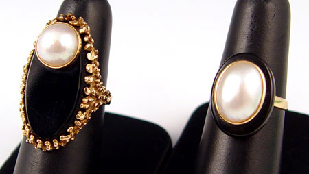 TWO 14K ONYX AND CULTURED MABE PEARL RINGS: 1) 14K yellow gold ring with one 14.00 x 11.00 mm oval shaped mabe cultured pearl. White with pink overtone. High Luster. Circled by a black onyx. Weight: 4.9 grams. Size: 8 2) 14K yellow gold nugget style ring with 30.00 x 15.00 mm oval shaped black onyx tablet and 10.00 mm round shaped mabe cultured pearl. White with pink overtone. Medium Luster. Weight: 11.7 grams. Size: 7 No Reserve.
