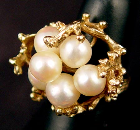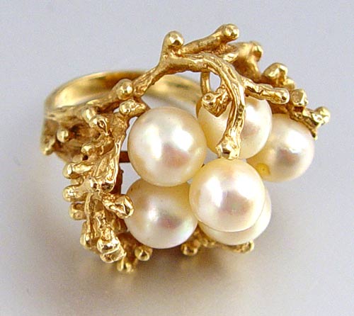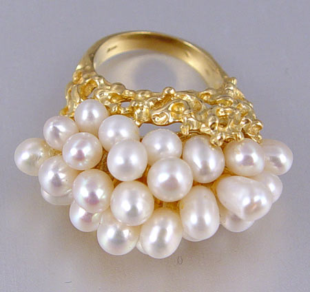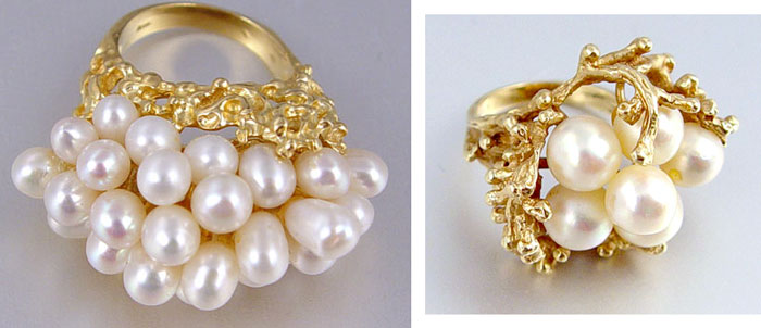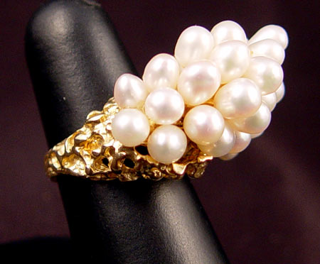 2 PEARL CLUSTER RINGS: 1) 14K yellow gold ring with 29 4.50 mm drop shaped cultured pearls. White with pink overtone. Slightly blemished. Medium/High Luster. High profile lacy nugget design. Weight: 17.8 grams. Size: 7 2) 14K yellow gold ring with 6 7.00-7.50 mm semi-round shaped cultured pearls. Cream with slight pink overtone. Blemished. Medium Luster. Stylized coral branch design. Weight: 14.3 grams. Size: 6.5 No Reserve.