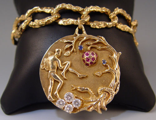 14K CHARM BRACELET WITH LARGE 1 CTW DIAMOND CHARM: 14K yellow gold charm bracelet of large oval nugget style links. 7'' in length. 14K yellow gold large disc shaped charm depicts a Garden of Eden scene. The charm contains 4 round brilliant cut diamonds. Weight: 1.00 Ct. Approx. Rated VS-SI in clarity and G-H in color. The charm also includes 14 small round rubies and 2 small round sapphires. Approx. 1.5'' in diameter. Weight: 52.2 grams. No Reserve.