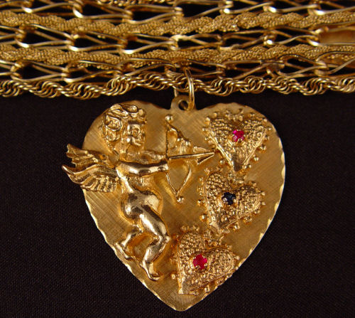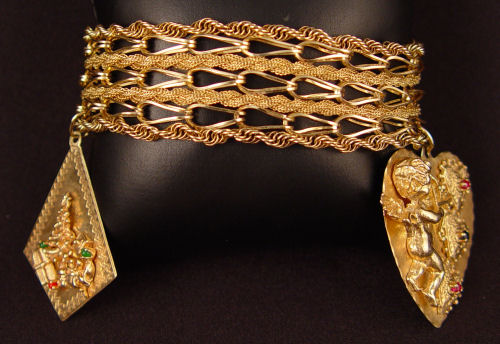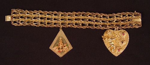 14K WIDE LINK BRACELET WITH 2 CHARMS: Heart shaped charm with cupid, and Christmas motif charm, each 1.5'' long. The bracelet is 7'' long, 7/8'' wide. 50.9 Grams overall. No Reserve.