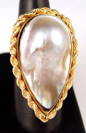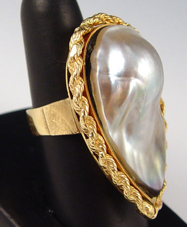14K CULTURED BLISTER PEARL RING: 14K yellow gold ring with a large 35.00 x 22.00 mm pear shaped cultured blister pearl. Silver with pink/green overtone. Low/Medium Luster. Rope bezel and wide shank. Weight: 29.3 grams. Size: 8.5 No Reserve.