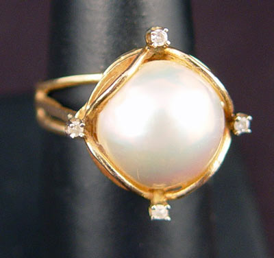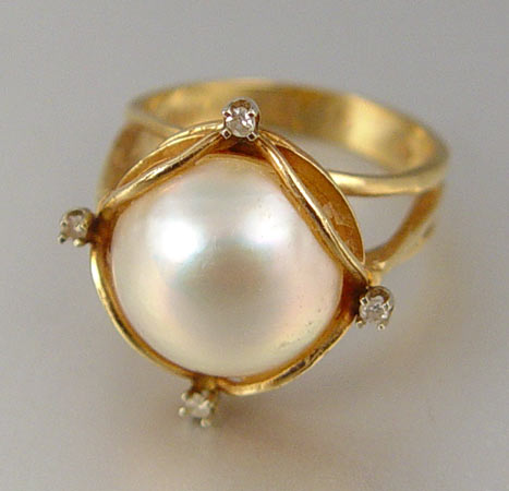 14K 13.00 MM CULTURED MABE PEARL AND DIAMOND RING: 14K yellow gold wire style ring with 13.00 mm round shaped mabe cultured pearl. Cream with pink overtone. High Luster. 4 round full cut diamonds. Weight: .05 Ct. Approx. Rated SI in clarity and I in color. Weight: 5.1 grams. Size: 6.5 No Reserve.