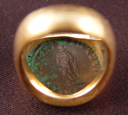 14K MAN'S ANCIENT GREEK COIN RING: 14K man's ancient Greek coin ring. The coin is bezel set. Note: this coin must be authenticated by an expert otherwise bid as it as a replica - Weight: 20.1 grams. Signed: Cathay Size 7.5 No Reserve.