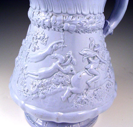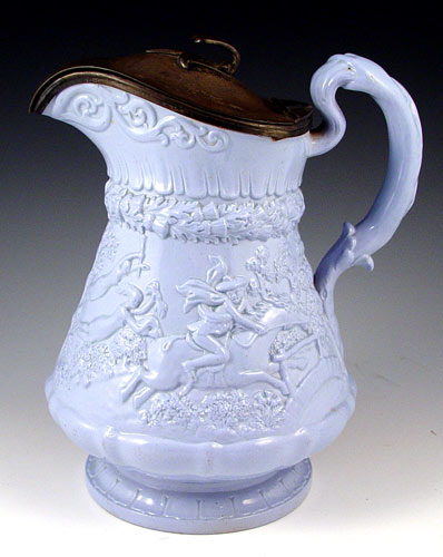RIDGWAY SALT GLAZE PITCHER PEWTER LID WITCHES SCENE: Blue salt glaze pitcher with scene of man at tavern, witches chasing home. Hinged pewter lid. Marked on base W. Ridgway & Co. Hanley October 1 1835. Measures 10 high to top of lid, 8'' wide.