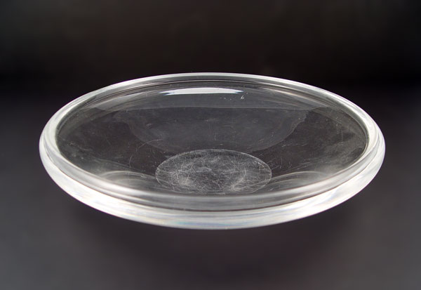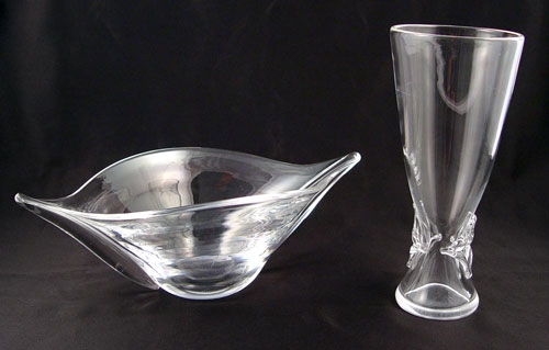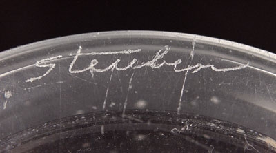 3 PIECE GROUP STEUBEN CRYSTAL: To include 1) Large bowl, note scratches on base. Measures 3'' high x 13 1/2'' dia. 2) Center bowl with flared sides, note scratches on base . Measures 4'' high x 12 3/8'' x 6 1/2''. Vase, note scratch ring around body and on base. Measures 9'' high x 4'' top dia. All signed Steuben.