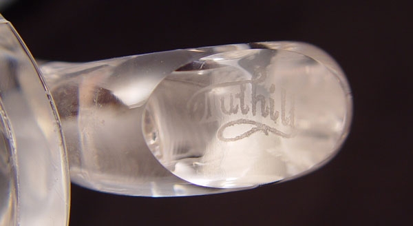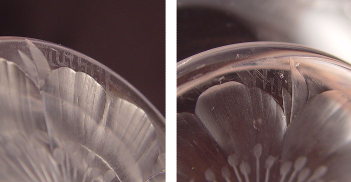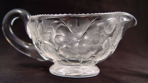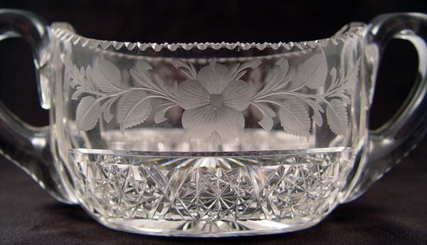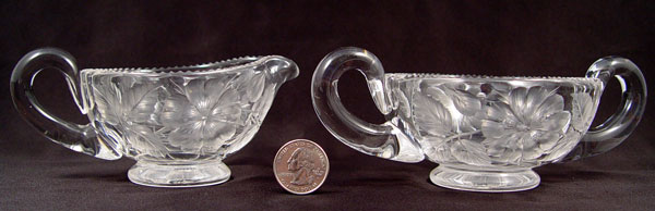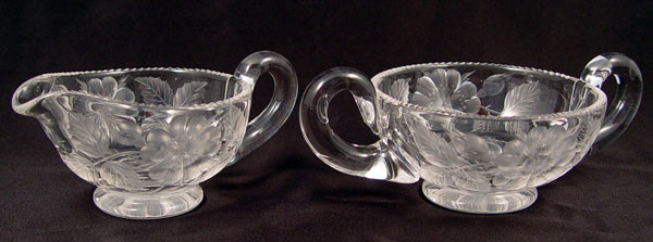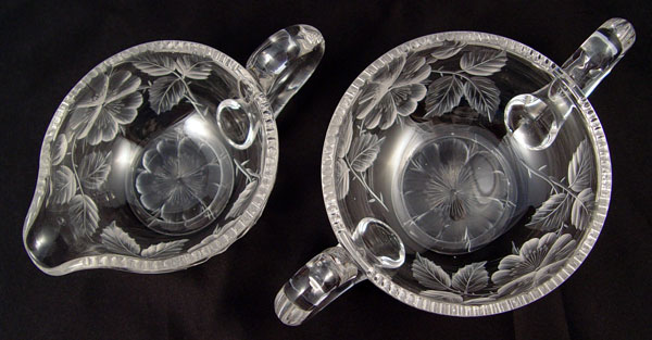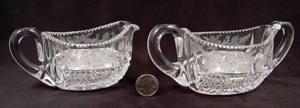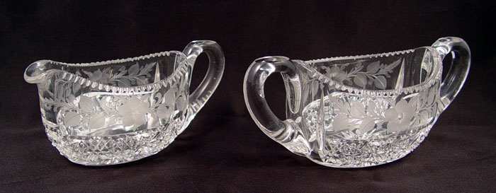 2 SETS SIGNED TUTHILL BRILLIANT CUT GLASS CREAM & SUGARS: To include 1) Pair cut in flower design, open creamer measure 2 1/2'', open sugar measures 2 5/8'' high x 6 1/2'' wide. Signed 2) Pair etched floral garland with hobstar base over flower design. Open creamer measures 2 3/4'' high, open sugar measures 3 1/8''. Signed on handle