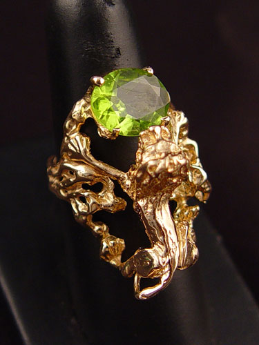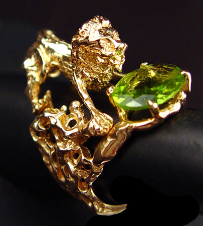 14K FIGURAL LION RING WITH LARGE PERIDOT: 14k yellow gold ring. One oval shaped mixed cut peridot, approx. 4.10 Ct., rated VSI in clarity, yG hue, 3 tone, and 2-3 saturation. The ring depicts a stylized lion, lacy nugget shoulders. Size 8. Weight 18.6 grams. No reserve.