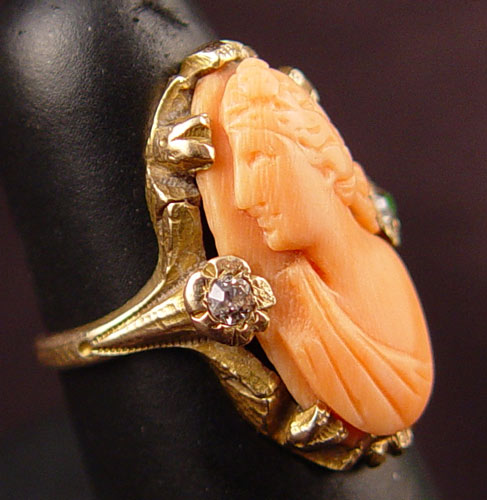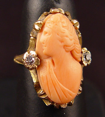 CARVED CORAL CAMEO RING WITH DIAMONDS: Coral with 2 diamonds, Size 5 2.5. No Reserve.