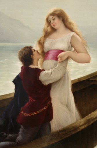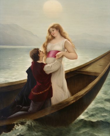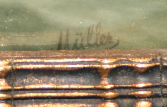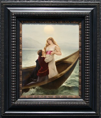 EARLY KPM PORCELAIN PLAQUE SIGNED MULLER: Depicts Lovers on a Boat in the Moonlight, signed, 11 1/2'' x 9'', signed, impressed markings verso, framed, 17 1/4'' x 14 3/4''.