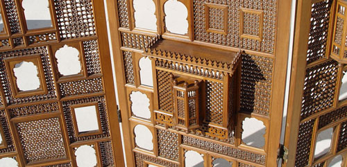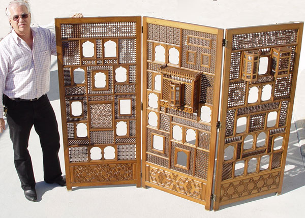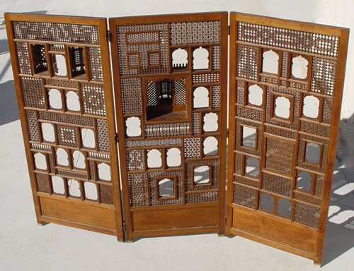 3 PANEL MUSHRABIA SCREEN: All wood 3 panel screen. Mushrabia panels with mushrabia harem peepholes. 64 1/2'' high x 82'' wide overall.