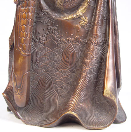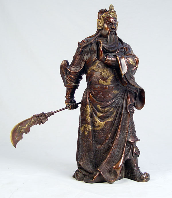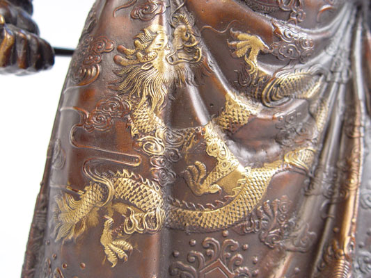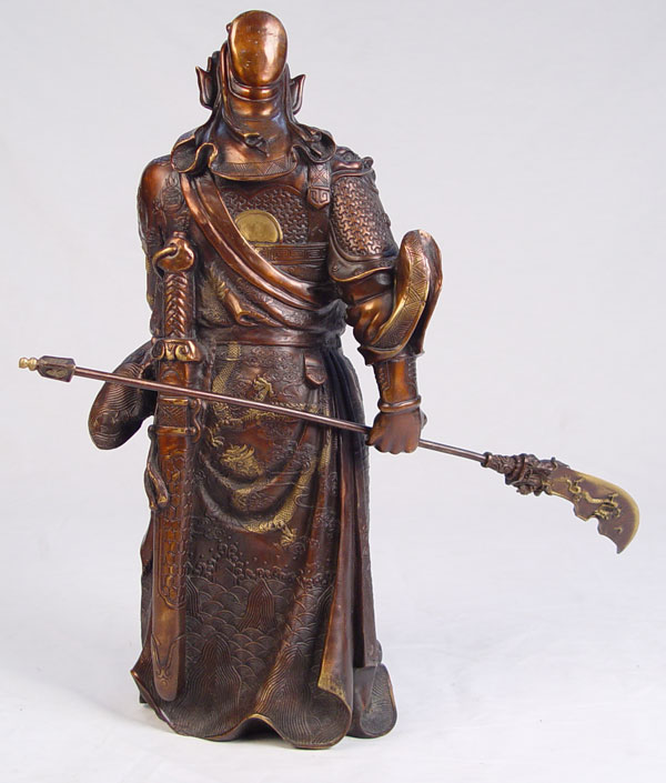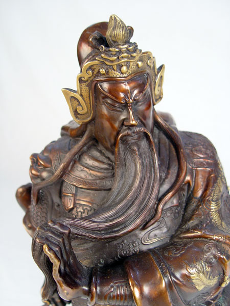 CHINESE BRONZE GUAN GONG: Bronze and mixed metal, 24''h. Statue of the most famous general in Chinese history, not mythological but an actual person from history. He lived in the period of the Three Kingdoms, 1700 years ago.