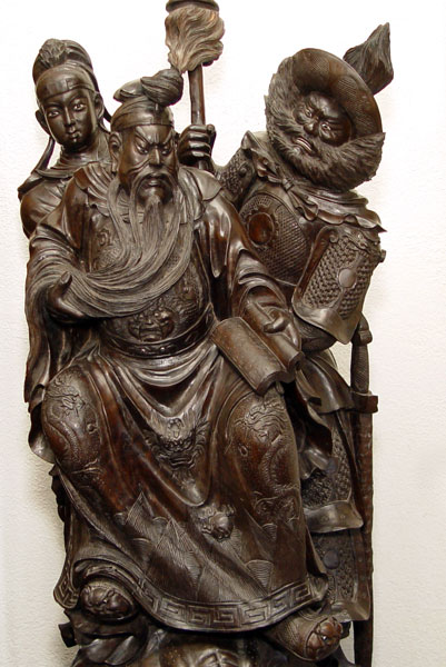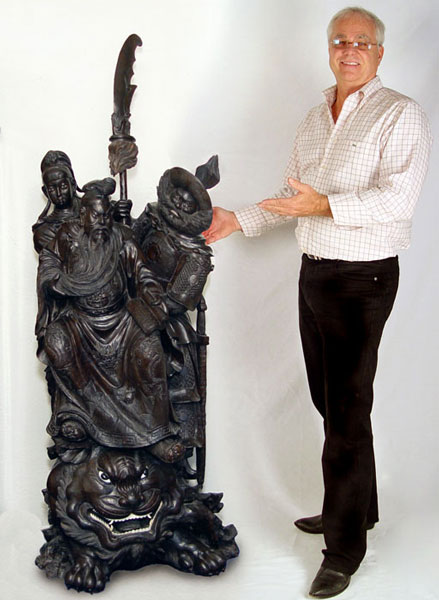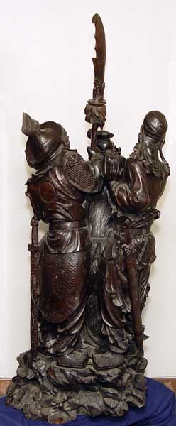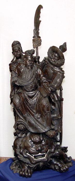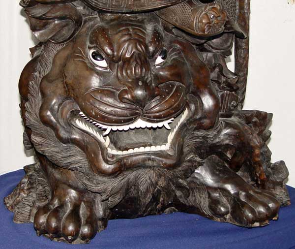 19th C JAPANESE ROSEWOOD PALACE STATUE: Depicts three figures on a mythological beast. Two of the figures wield a sword, one a book. 5'5'' high x 2' x 2''.