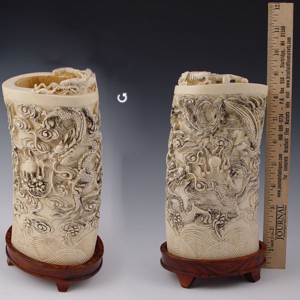 CARVED IVORY TUSK VASE: Heavily carved with dragons, figural birds and flowers. Carved dragon along top of lid. Signed on bottom in characters. On wood stand. Measures 7 3/4'' high x 4'' across. Overall 9'' high on stand.