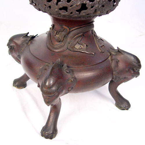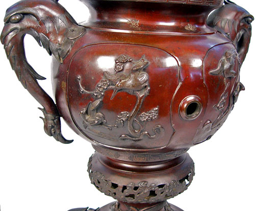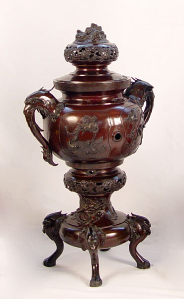 LARGE ORIENTAL EAGLE HEAD BRONZE CENSOR ON STAND: Handles in the form of eagle heads, 3 parts- censor, interior tray and stand. 38''h., 23'' wide.
