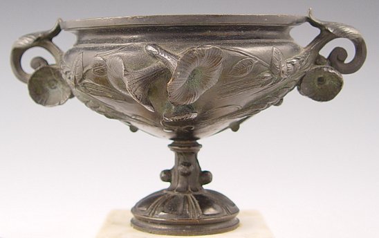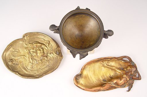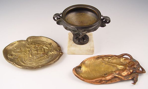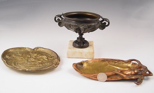 3 PIECE BRONZE LOT TAZZA, 2 NOUVEAU TRAYS: To include 1) Bronze tazza with floral design on marble base. Marked Italy on base. Measures 4 3/4'' high x 6 3/4'' wide. 2) Metal nouveau nude tip tray. Measures 8'' x 4 1/2''. 3) Metal nouveau smoking woman tip tray. Measures 7 1/2'' x 5 3/4''.