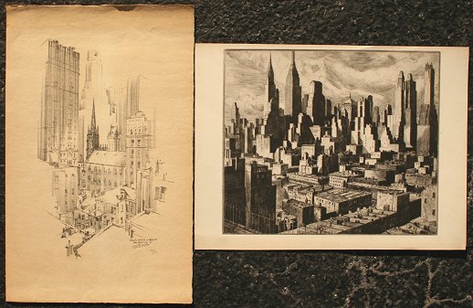 2 PIECE NEW YORK CITY PRINTS: Unsigned etching of New York City, 12'' x 16'', Lou Forrester Lithograph of New York, 17 1/2'' x 11'', pencil signed and numbered 200/300, toned upper margin, both unframed.