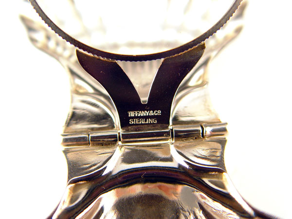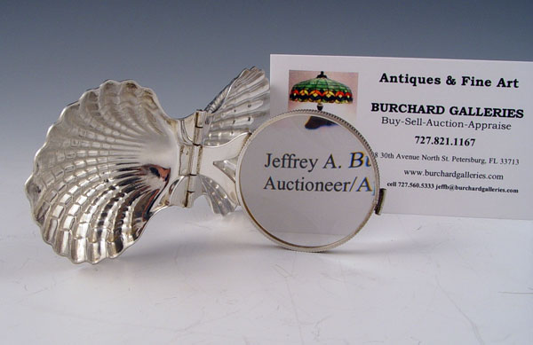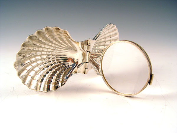 TIFFANY & CO STERLING CLAM SHELL FORM MAGNIFIER: Travel magnifying glass in hinged shell form case. Marked Tiffany & Co Sterling. 2 1/4'' x 2'' wide closed.