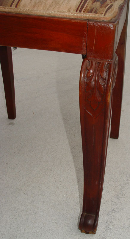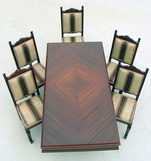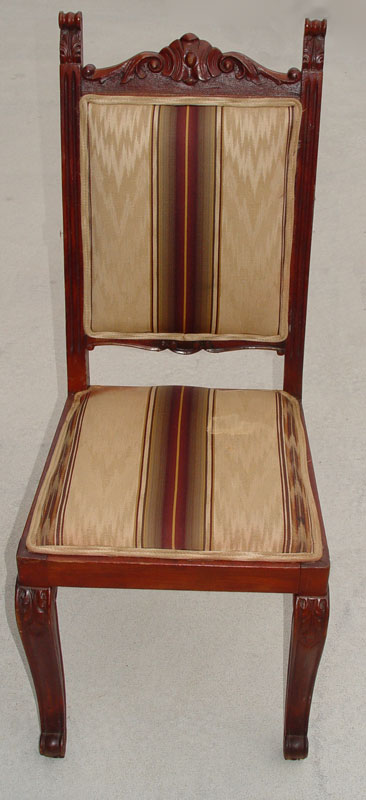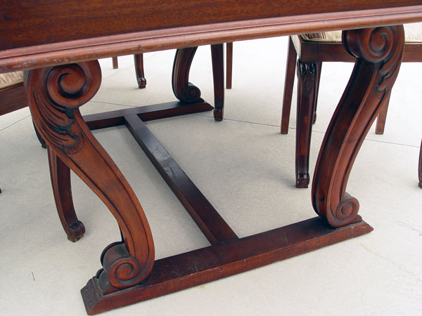 MAHOGANY LIBRARY / DINING TRESTLE TABLE & 6 CHAIRS: Matchbook veneer table top on scroll legs, measures 31'' high x 68 1/2'' long x 35 3/4'' wide. 6 side chairs with carved crest, scrolled legs match the table legs. Measures 42 3/8'' high x 15 3/4'' wide x 17 1/2'' deep.
