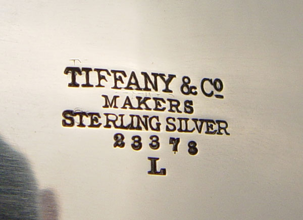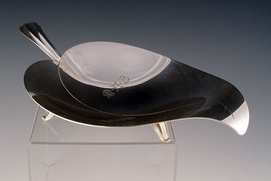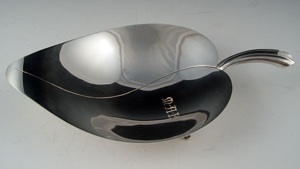 TIFFANY & CO. STERLING LEAF FORM DISH: Marked Tiffany & Co. Sterling Silver and numbered. 3 feet, monogrammed MAB. Measures 2'' high x 11 1/4'' long x 6 1/8'' wide. Approx 11.1 troy oz. Please note several minor scratches