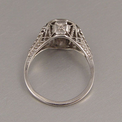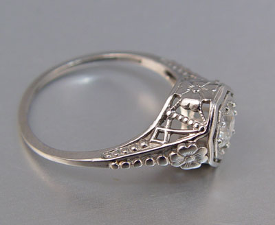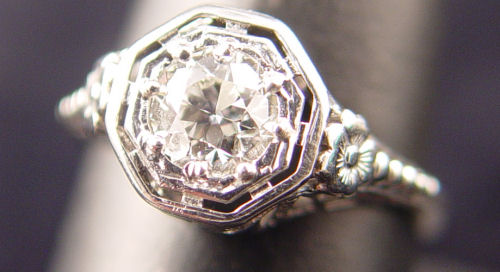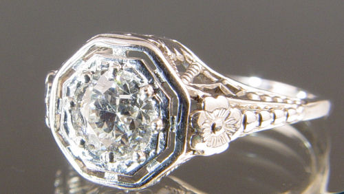 WHITE GOLD FILIGREE OLD EUROPEAN CUT DIAMOND RING: 18K white gold filigree ring centering an approx. .65 Ct Old European round diamond, SI1 clarity, H color. The diamond is bead set. Weight 2.6 grams. Sold with an appraisal by a GIA graduate for $2995.00.