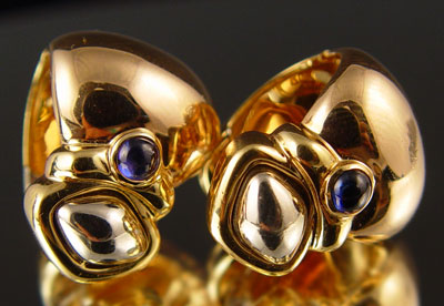 18K ITALIAN TWO TONE GOLD FASHION EARRINGS: 18K yellow and white gold earrings with 2 round shaped cabochon cut sapphires, .25 Ctw. Approx. The sapphires are bezel set. Weight: 19.8 grams. Post and hinged ''huggie'' style closures. Approx. 1'' in length.