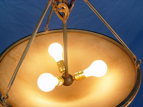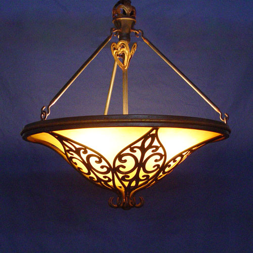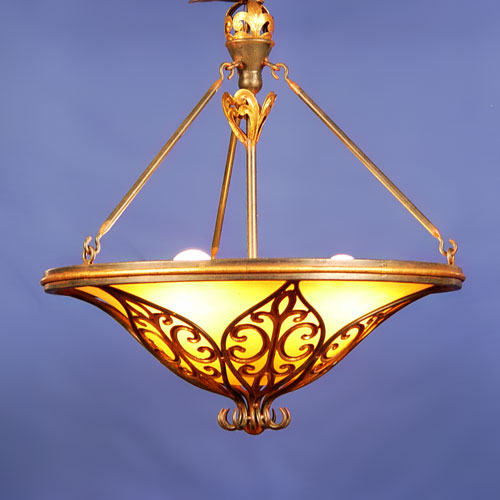 CURREY & CO. ''EXPOSITION PENDANT'' CHANDELIER: Old Brass metal finish. 22'' dia., hangs 23''. Glass dome shade with filigree metal. Currently retails for $999.