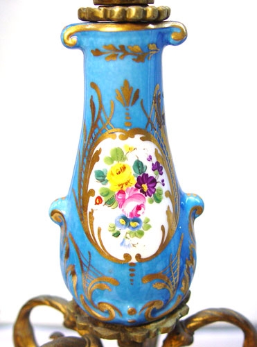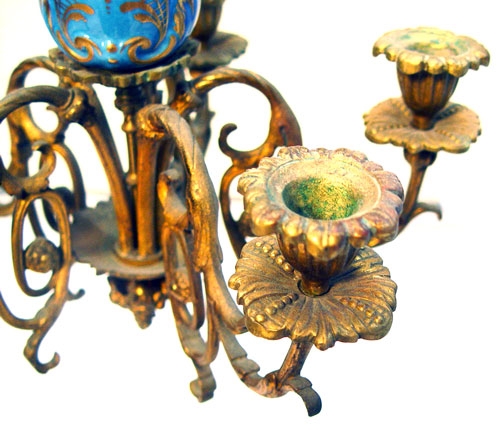 DIMINUTIVE FRENCH PORCELAIN AND BRONZE CANDLE CHANDELIER: 5 candle lights, hand painted porcelain, hangs from a decorative chain. Not electric. 12'' h. x 11'' dia.