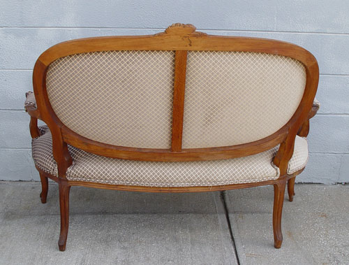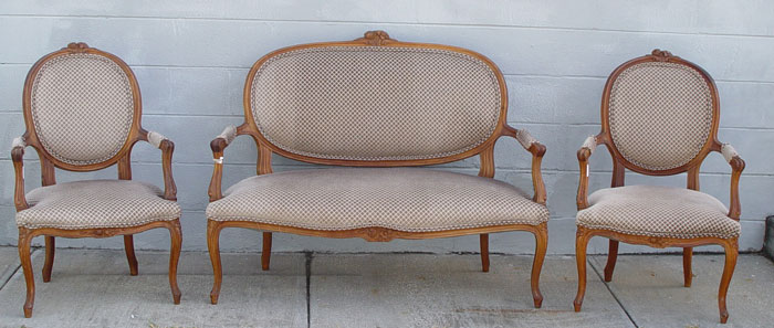LOUIS XV STYLE 3 PIECE PARLOR SET: Open arm settee and 2 open arm bergere chairs. Carved top rail, carved cabriole legs. Natural wood finish. Later 20th century. Measures 39'' high x 50 1/2'' wide x 28'' deep. Arm chairs measure 37'' high x 24'' wide x 24'' deep.