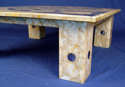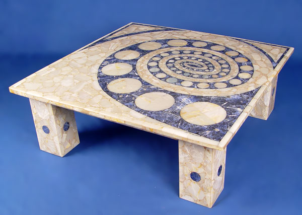 CONTEMPORARY MARBLE MOSAIC COFFEE TABLE: Geometric lapis colored and cream marble table top on marble legs. 15 1/4'' high x 43 1/4'' square.