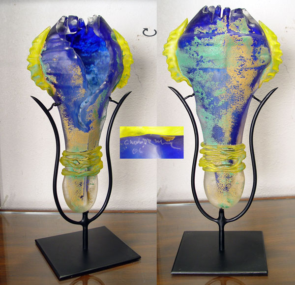 CHRIS MOSEY IGNIS GLASS STUDIO CONTEMPORARY ART GLASS: ''Chrysalis Amber'', 24''h, mounted on a 9''square iron base.