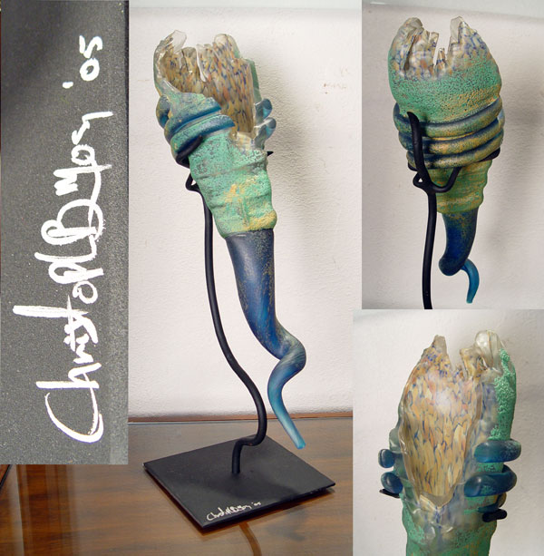 CHRIS MOSEY IGNIS GLASS STUDIO ART GLASS: ''Chrysalis Silver Blue'', 27''h, mounted on a 9'' square iron base.