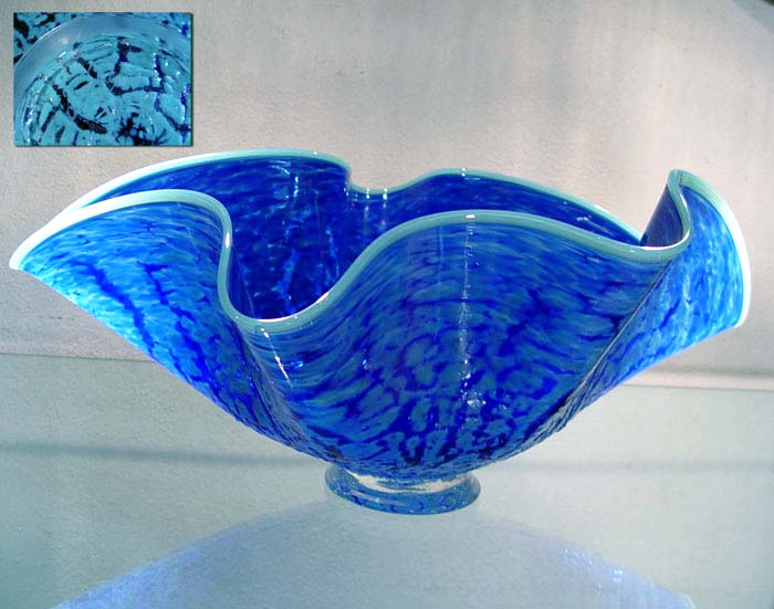 CHRIS MOSEY IGNIS GLASS STUDIO ART GLASS FLUTTERBOWL: Blue / green with light blue rim, 16''h. x 22 1/2'' x 8''.