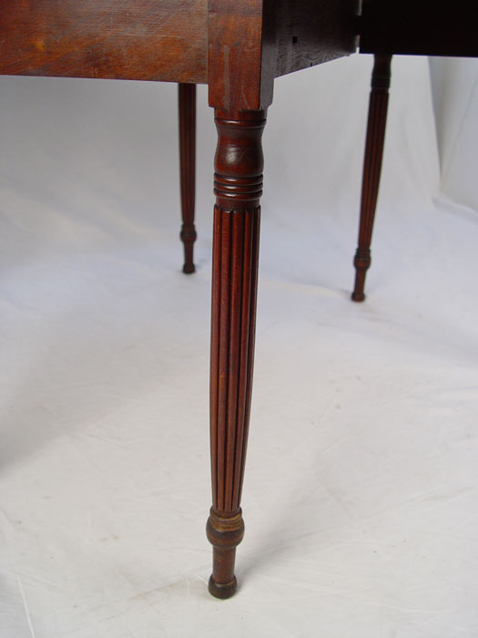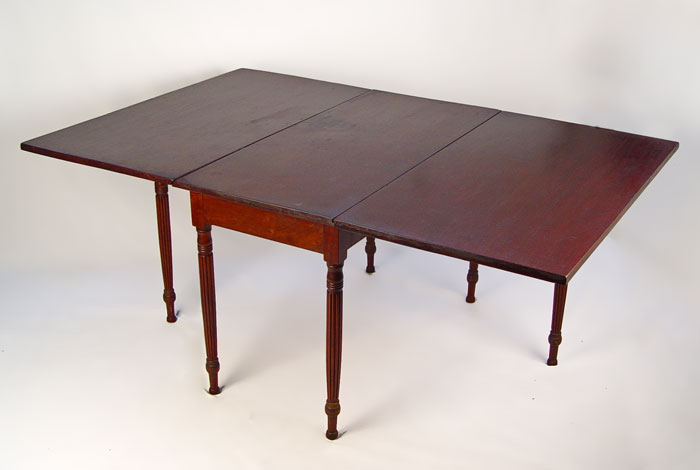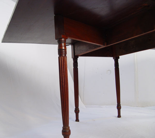 DARK MAHOGANY DROP LEAF TABLE: Circa 1880, 4 supporting reeded legs, plus 2 reeded swing legs, extends to 70 inches. Measures 29'' high x 46 3/4'' long x 21'' wide closed. Each side 25'' long.