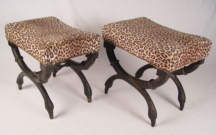 PAIR CARVED BLACK GESSO SWAN LEG BENCHES: Curved legs end in swan feet, later leopard upholstery. Please note loss of one stretcher, and condition of finish. Measures 21 1/2'' high x 24'' wide x 16 1/2'' deep.