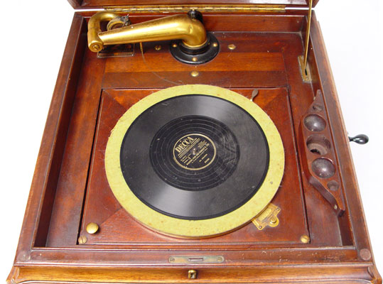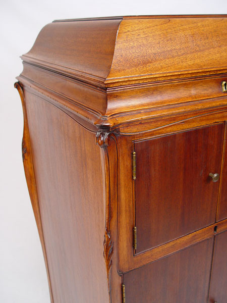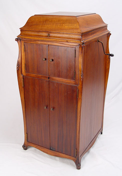 1919 UPRIGHT CABINET VICTROLA VV XVI: Circa 1919, oak case with decorated corners. Serial #164566. Cranks and turntable spins fine. Standard doors on case. 46 1/2'' high x 22 1/2'' wide x 24 1/2'' deep.